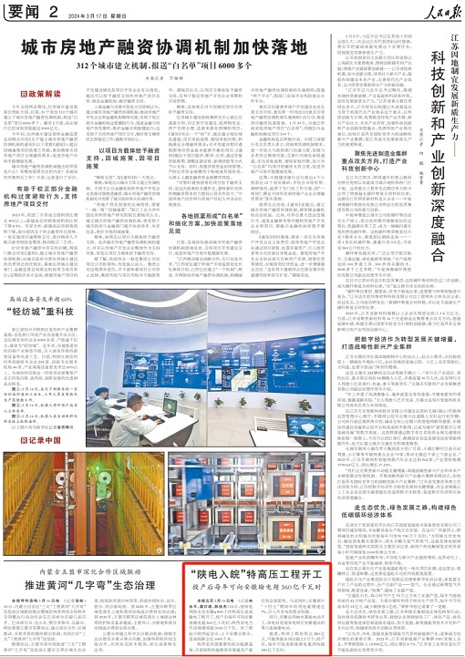 15日,国家电网陕北至安徽±800千伏特高压直流输电工程开工,投产后每年可向安徽省输电超360亿千瓦时,陕西省电力外送规模将超3100万千瓦。该工程起于陕西延安市,止于安徽合肥市,直流线路全长1069千米。 陕西是我国重要的综合能源基地,目前探明的能源保有储量及产量位居全国前列。与此同时,安徽预计“十四五”期间年均用电量增速达7%,引入外来电的需求较强。 同日,安徽岳西抽水蓄能电站开工,该电站是国家电网在安徽建设的第八座抽蓄电站。 据悉,两项工程投资达280亿元,可提供就业岗位超2.3万个;投产后,每年可促进新能源电量消纳超180亿千瓦时。 (本文刊发于《人民日报》2024年3月17日2版)
