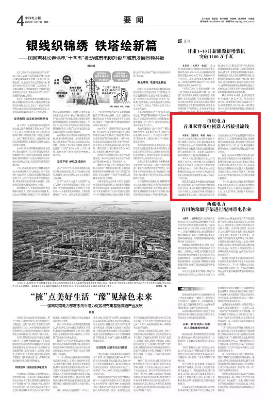 本报讯 (游绍斌 蒋佩 赵毅)11月12日,在重庆市璧山区双狮大道10千伏七璧线日科分支4号杆,重庆璧山供电公司带电作业人员正操控双臂人机协同配网带电作业机器人精准完成新建线路的引流线搭接任务。这是重庆首次使用该类型机器人开展引流线搭接作业。