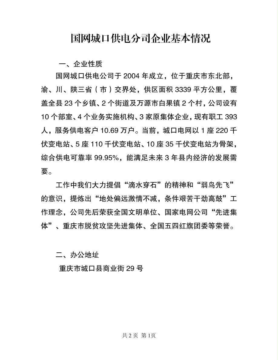 国网重庆市电力公司城口供电分公司基本情况介绍