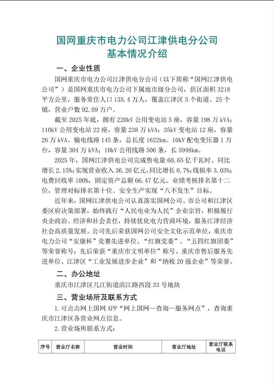 国网重庆市电力公司江津供电分公司基本情况介绍
