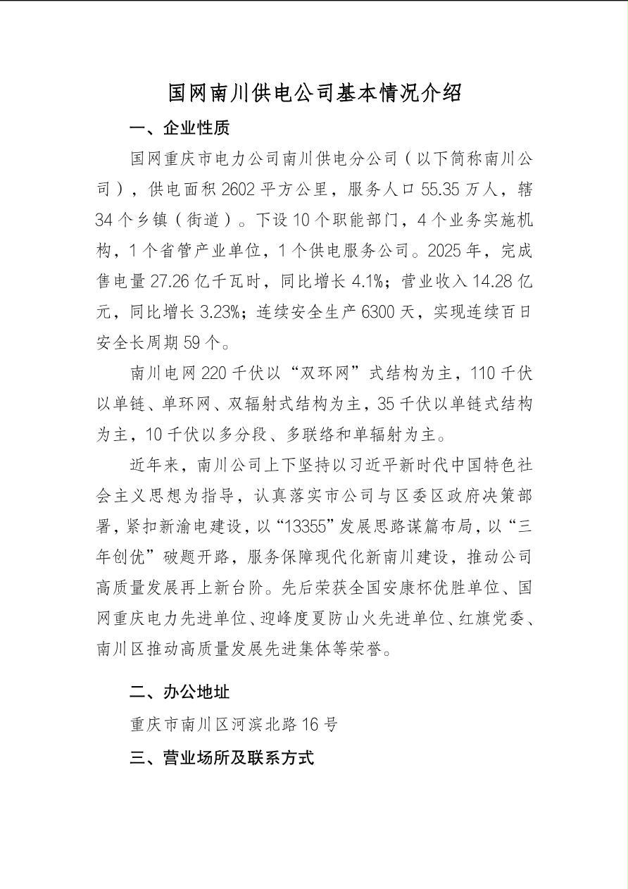 国网重庆市电力公司南川供电分公司基本情况介绍