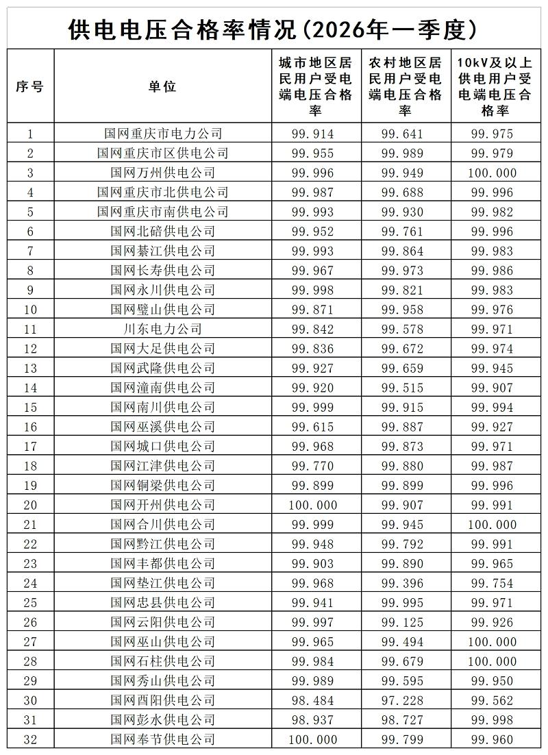 供电电压合格率情况(2026年一季度)