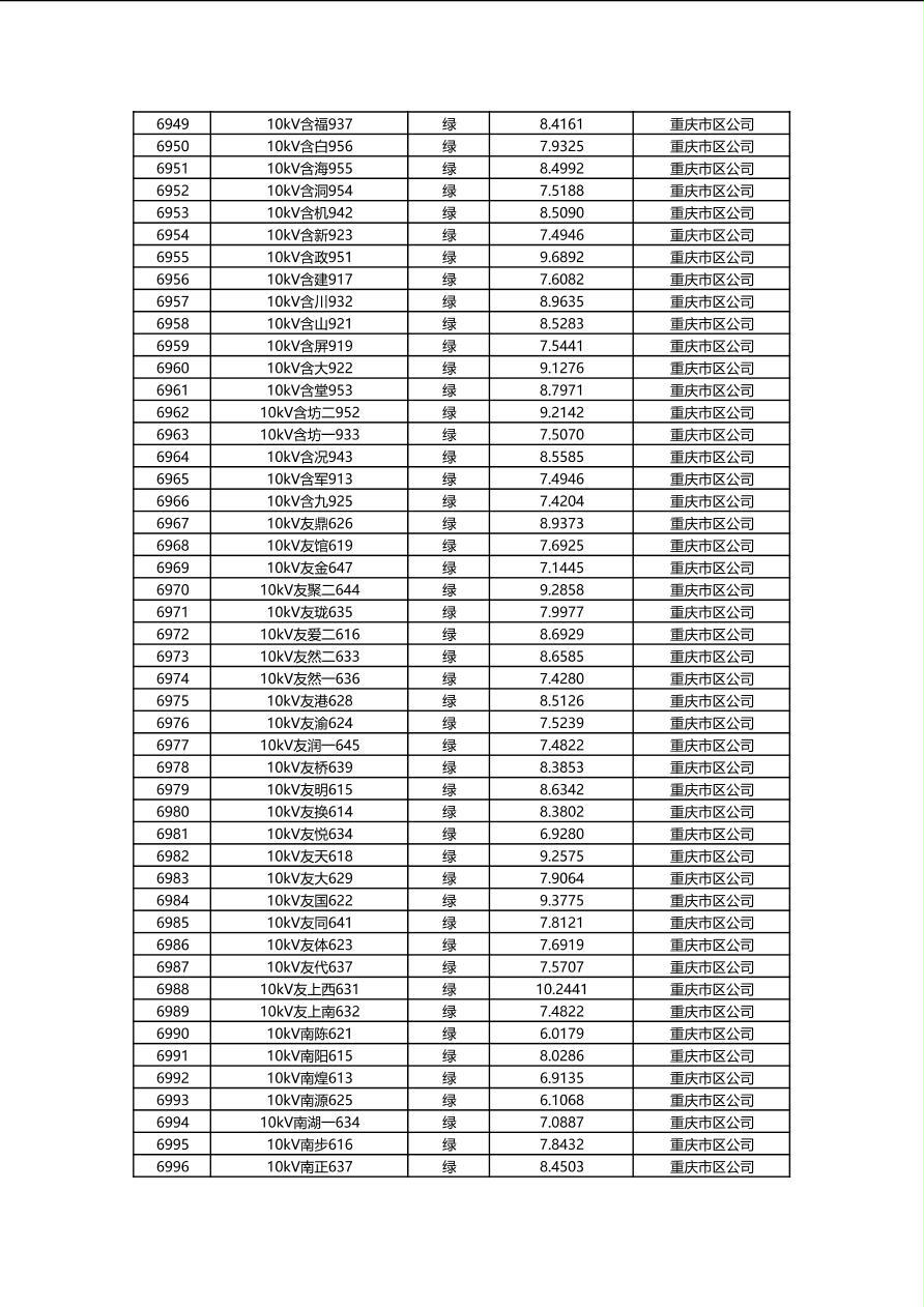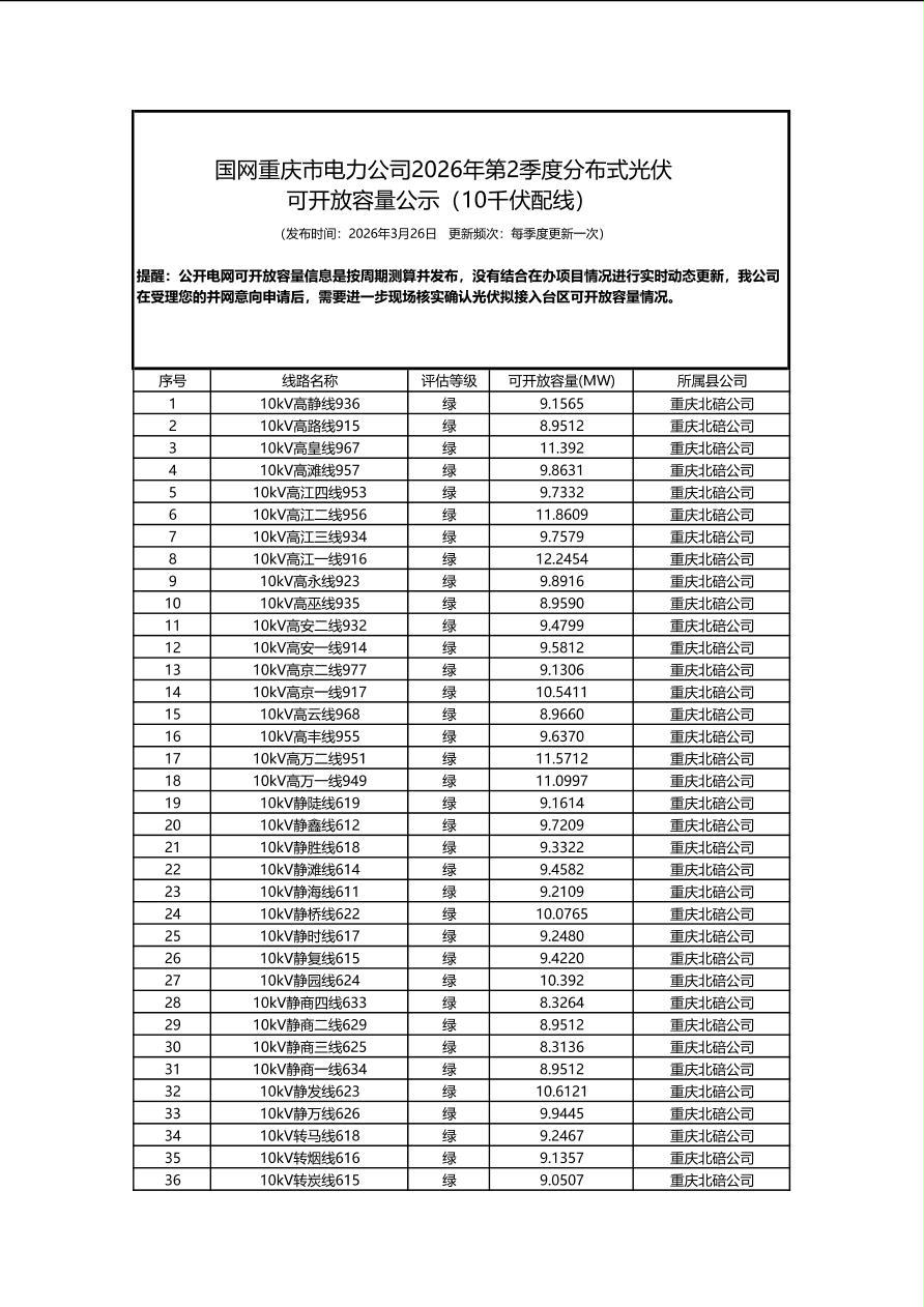 国网重庆市电力公司2026年第2季度分布式光伏可开放容量(10千伏配线)