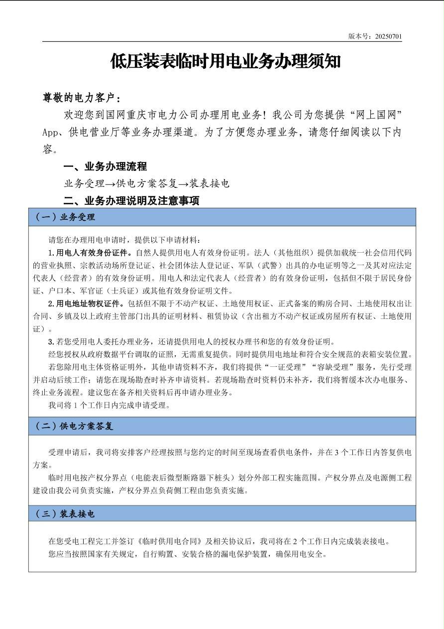 低压装表临时用电业务办理须知