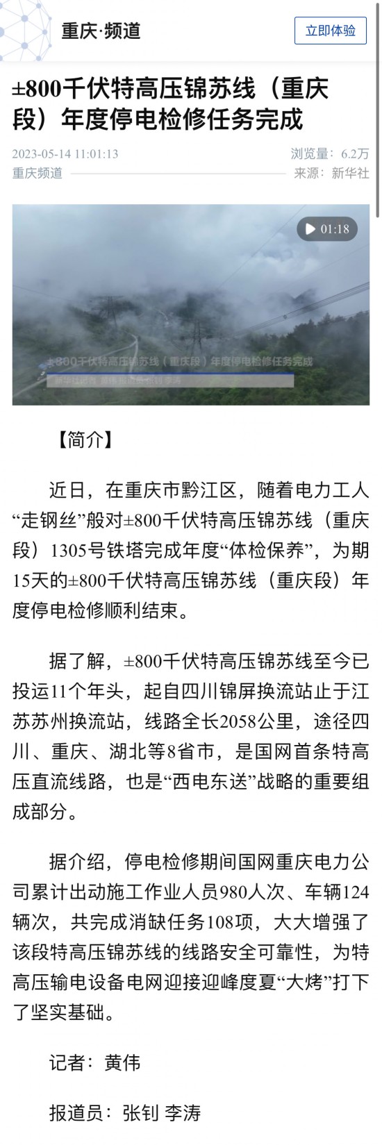 【新华社】±800千伏特高压锦苏线(重庆段)年度停电检修任务完成