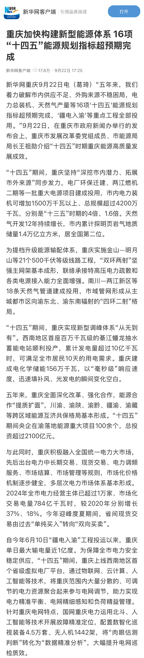 【新华网】重庆加快构建新型能源体系 16项“十四五”能源规划指标超预期完成