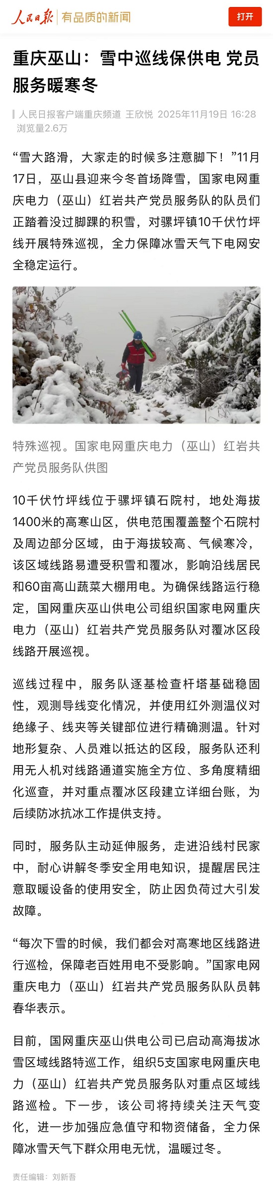 【人民日报】重庆巫山:雪中巡线保供电 党员服务暖寒冬