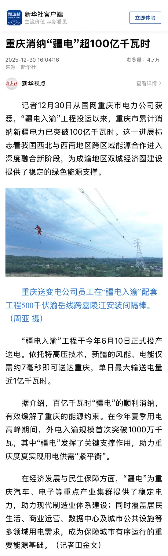 【新华社】重庆消纳“疆电”超100亿千瓦时