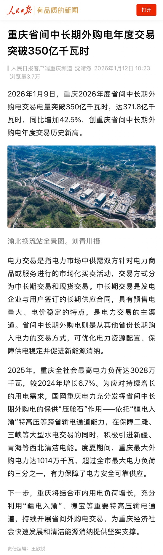 【人民日报】重庆省间中长期外购电年度交易突破350亿千瓦时