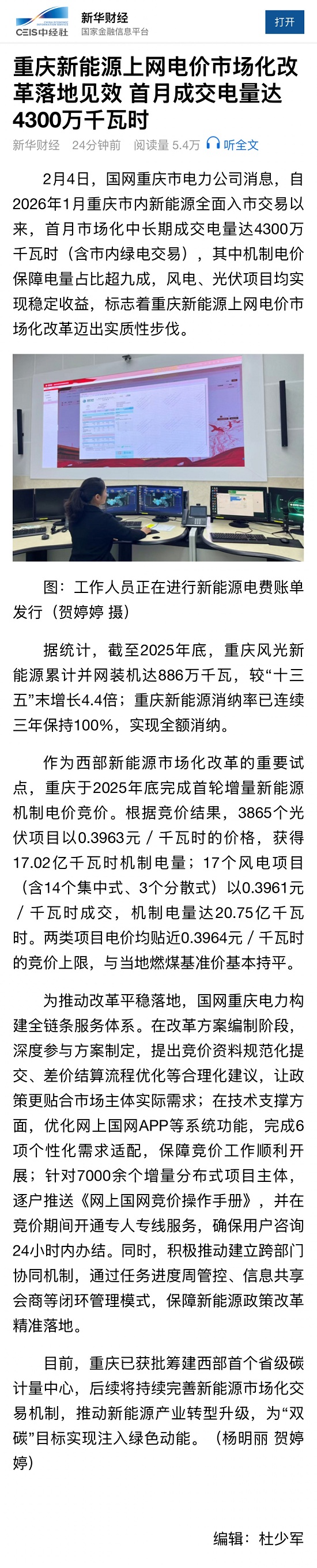 【新华财经】重庆新能源上网电价市场化改革落地见效 首月成交电量达4300万千瓦时