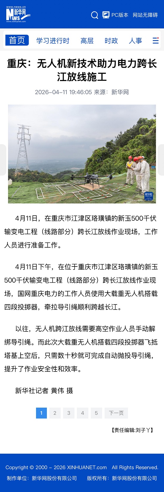【新华网】重庆:无人机新技术助力电力跨长江放线施工