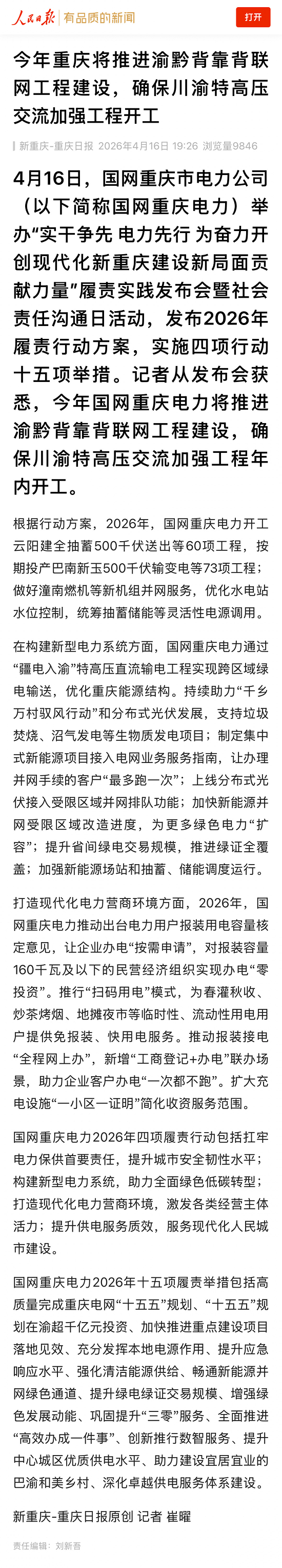 【人民日报】今年重庆将推进渝黔背靠背联网工程建设,确保川渝特高压交流加强工程开工