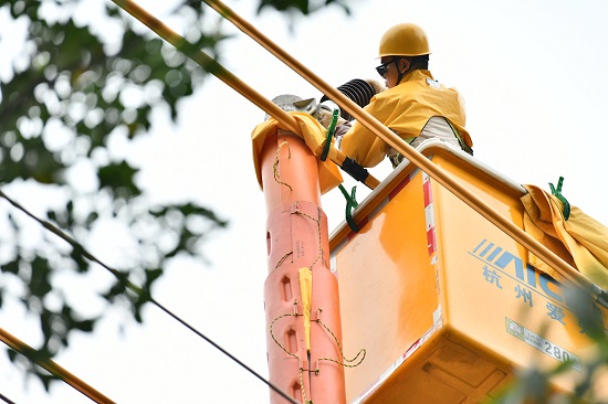 国网万州供电公司员工在梁平区梁山街道开展带电立杆工作。(黄凌霜 摄)
