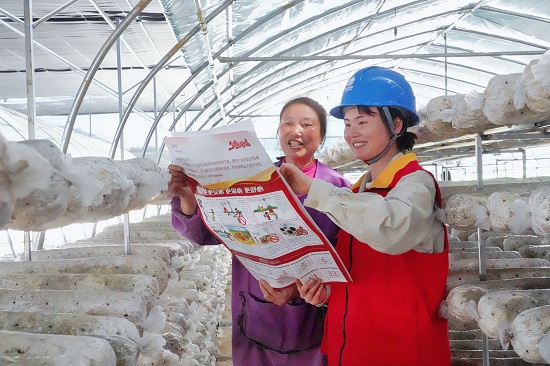 国网万州供电公司员工在重庆梁平区铁门乡长塘村香菇智能化种植基地宣传安全用电知识(黄凌霜 摄)