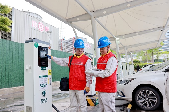 国网大足供电公司员工在大足区圣迹湖公园充电站检查充电设备(王非凡 摄)