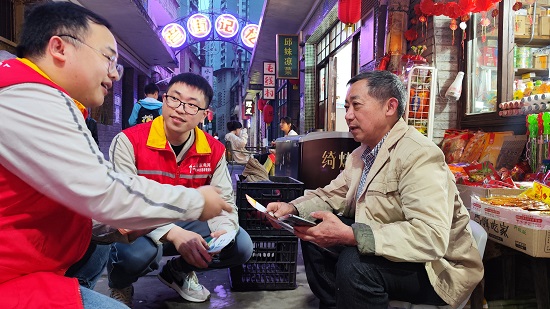 国网忠县供电公司员工在忠州老街对商户开展安全用电宣传(罗建 摄)