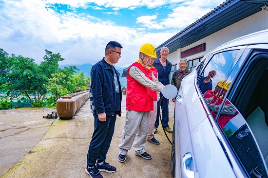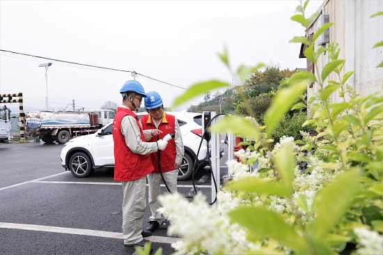国网长寿供电公司员工服务农户电动汽车用电(况敏 摄)