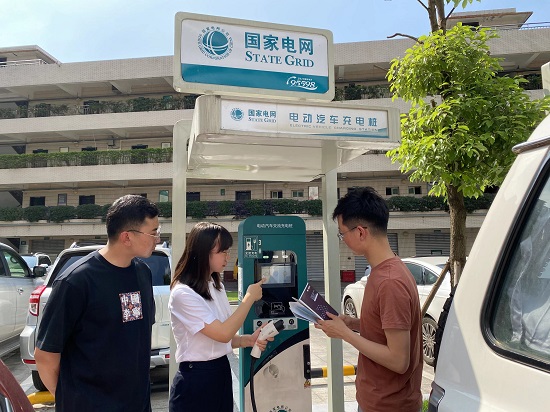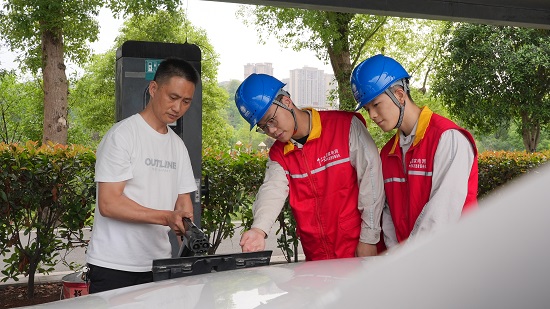 国网城口供电公司员工在沱溪河生产基地指导电动车车主使用充电桩(冉昊天 摄)