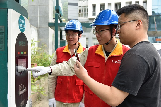 国网北碚供电公司员工在文凤村广场检查充电桩设备(张强 摄)