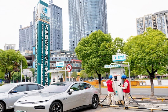 国网万州供电公司员工在万州樱花渡电动汽车充电站开展例行检查(黄凌霜 摄)