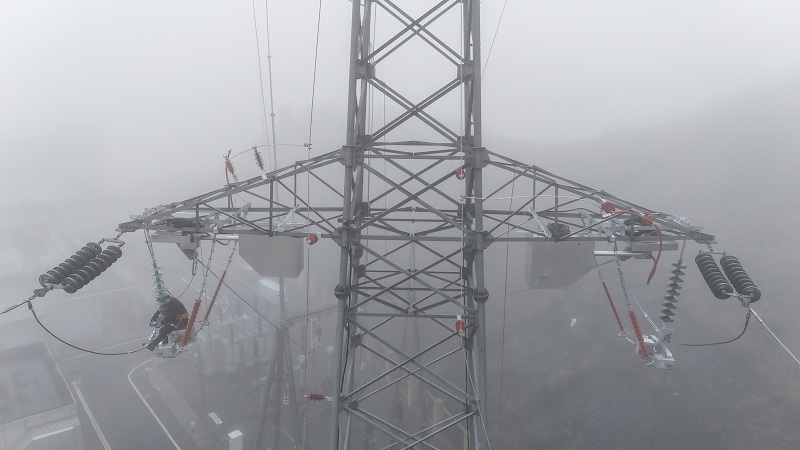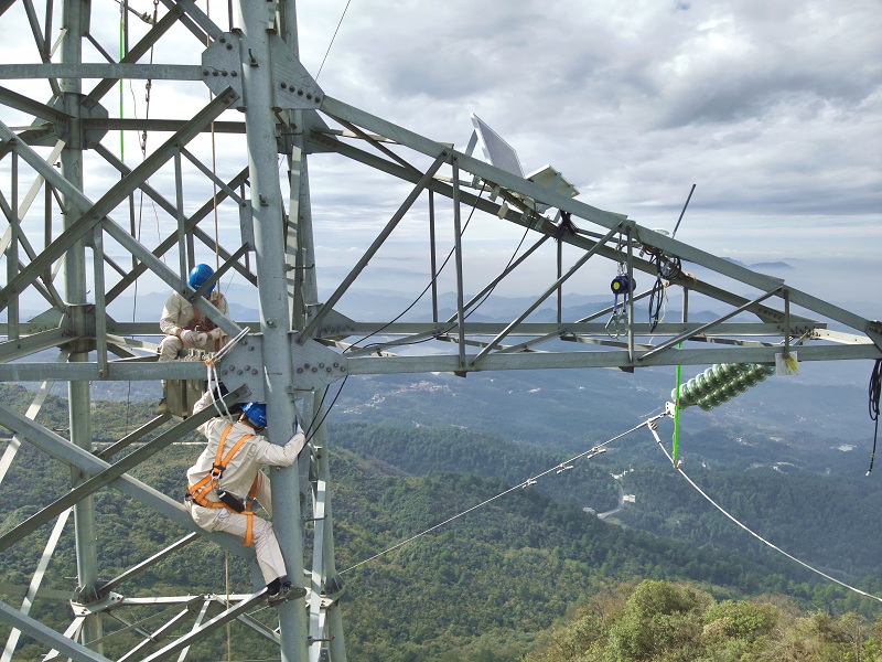 国网綦江供电公司无人机及检修班员工在110千伏南盛线开展监测装置安装工作。(刘艺民 摄)