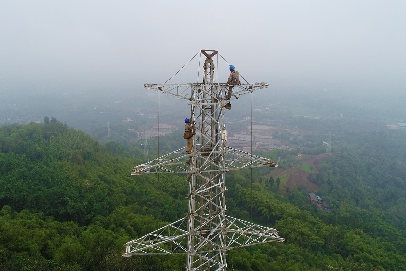 国网合川供电公司员工在110千伏风古线56号塔进行线路迁改作业。(刘思言 摄)