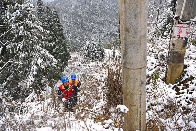 国家电网重庆电力(彭水)红岩共产党员服务队队员在10千伏黄戈线大洋支线踏雪巡线。(储潇 摄)