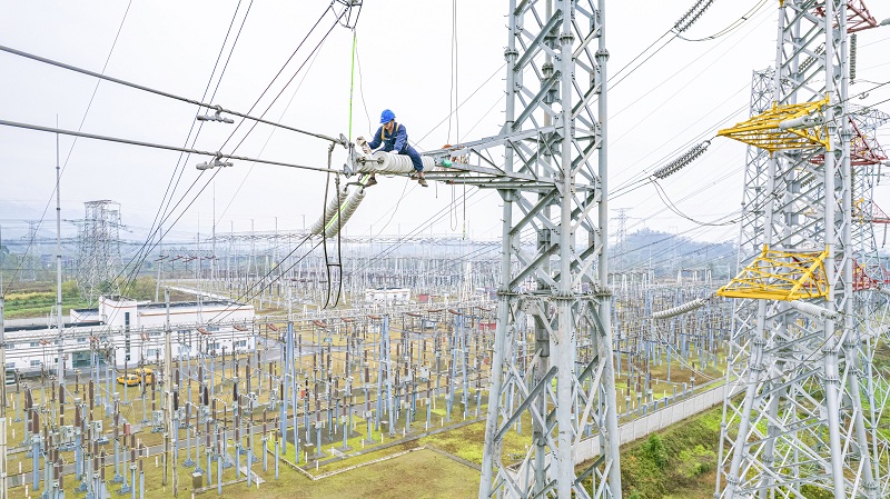 国网长寿供电公司员工冒着冻雨对220千伏长恩西线1号塔耐张绝缘子进行清扫。(况敏 摄)