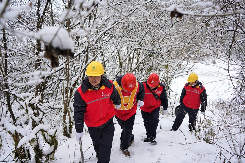 国网酉阳供电公司员工冒雪对220千伏永酉西线开展巡视工作。(庞涛丹 摄)