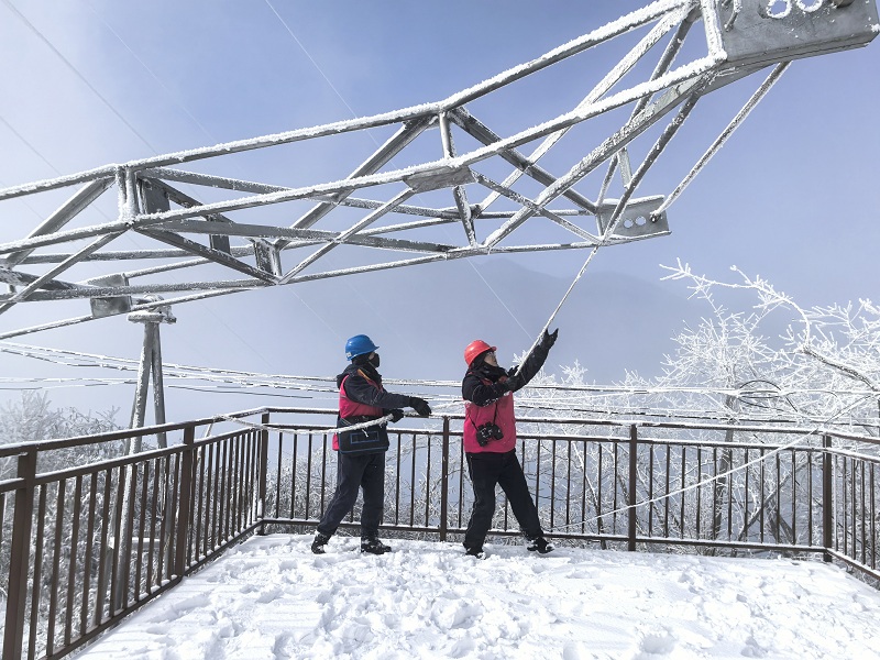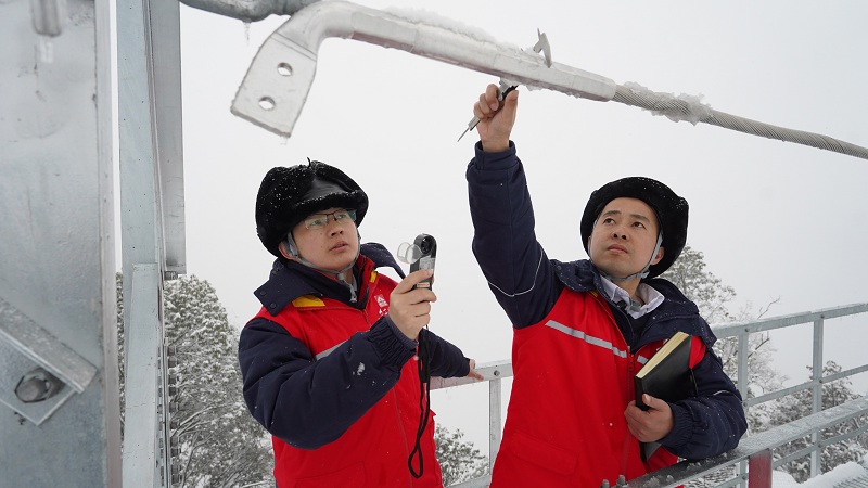 国网城口供电公司员工对220千伏华城线开展线路覆冰监测。(陈鉴森 摄)