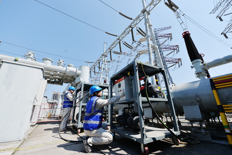 国网重庆市区供电公司员工在220千伏龙荫变电站对220千伏GIS设备进行全停检修和扩建作业。(韩薇 摄)