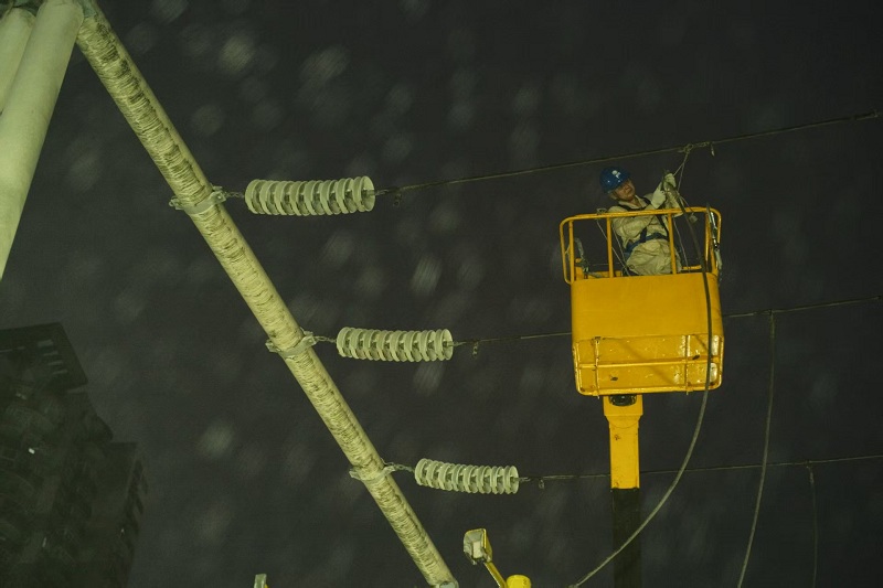 国网重庆市区供电公司员工在沙坪坝光荣坡社区紧急消缺10千伏受损线路。(韩薇 摄)