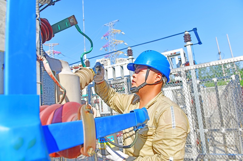 国网忠县供电公司员工在110千伏拔山站处置2号主变连接螺栓发热隐患。(杨逸 摄)