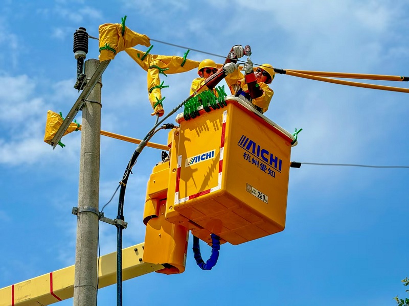 国网黔江供电公司员工在10千伏石大线水市烟站支线2号杆开展带电作业。(何玥晗 摄)
