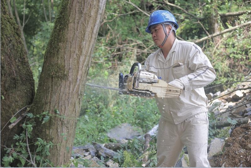 国网武隆供电公司员工在10千伏贾石线石大支线16号杆清理树障。(谭宇凌 摄)