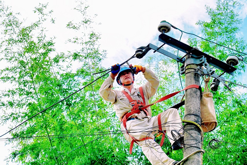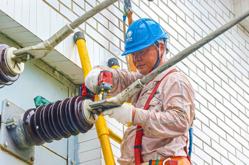 国网万州供电公司员工在梁平区云龙镇人民村对10千伏云水线进行绝缘导线更换。(黄凌霜 摄)