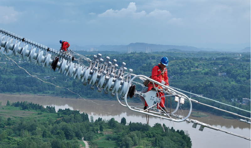 重庆送变电公司员工在500千伏渝岳线跨嘉陵江段安装间隔棒。(周亚 摄)